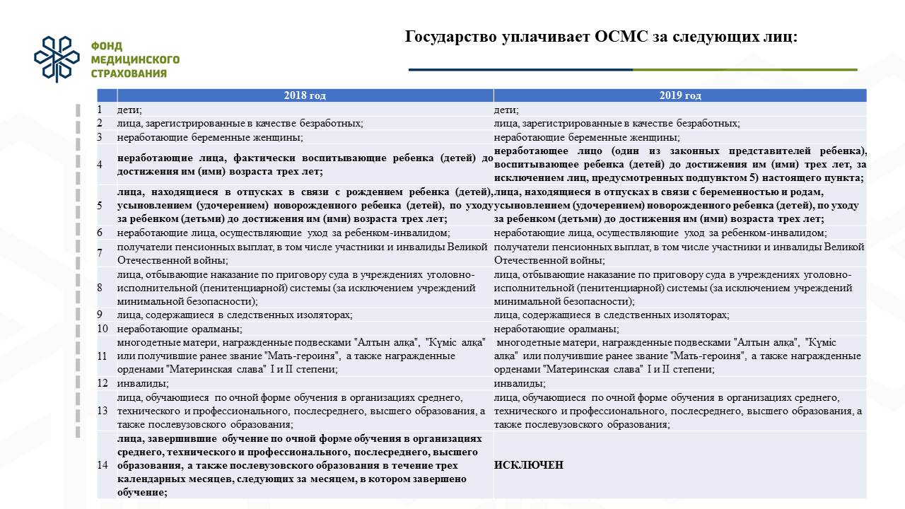 2020 жылдан бастап мемлекет азаматтардың 13 санатына сақтандыру жарнасын аудара бастайды, атап айтсақ: