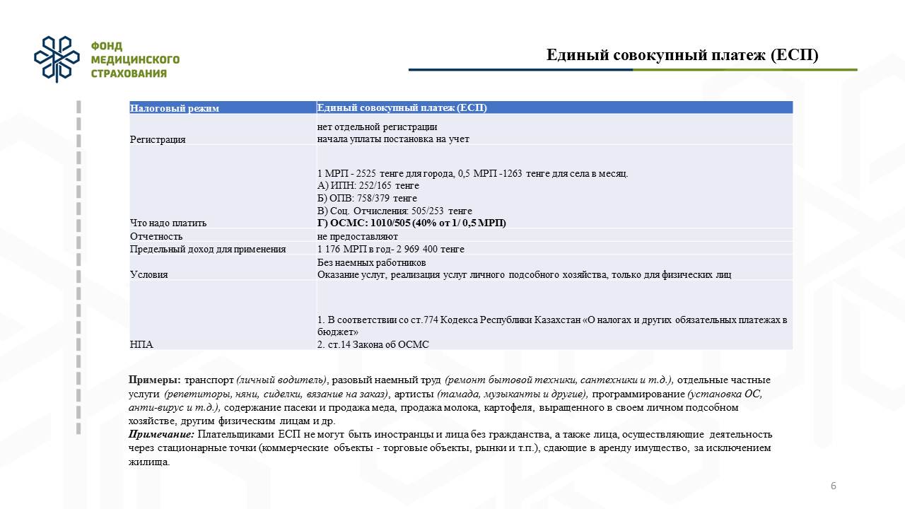 Сондай-ақ, 2019 жылдың қаңтарынан бастап бірыңғай жиынтық төлем (БЖТ) енгізілді. Оның ішінде, басқа әлеуметтік төлемдермен қатар міндетті әлеуметтік медициналық сақтандыру (МӘМС) жарнасы да бар. Бұл төлем азаматтарға міндетті әлеуметтік медициналық сақтандыру жүйесіне қатысуға мүмкіндік береді. Бірыңғай жиынтық төлемді еңбек етіп жүрген, жалдамалы жұмысшылар еңбегін пайдаланбайтын, жеке тұлғаларға қызмет көрсететін жеке тұлғалар төлейді. Төлем республикалық, облыстық маңызы бар қалаларда 1 айлық есептік көрсеткіш (АЕК) болса, басқа елді мекендерде (ауыл, аудан т.б.) 0,5 АЕК құрады. Айлық есептік көрсеткіш мөлшері бүгінгі таңда 2 мың 525 тенгені құрап отыр.