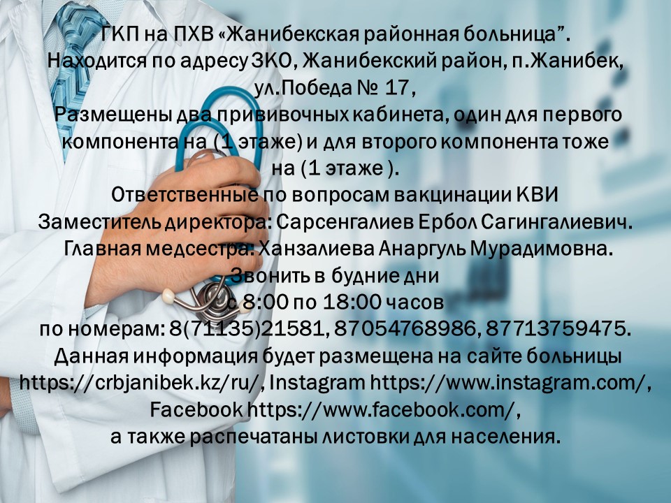ЦРБ находится по адресу: Западно-Казахстанская область, Жанибекский район, п.Жанибек, ул.Победа 17